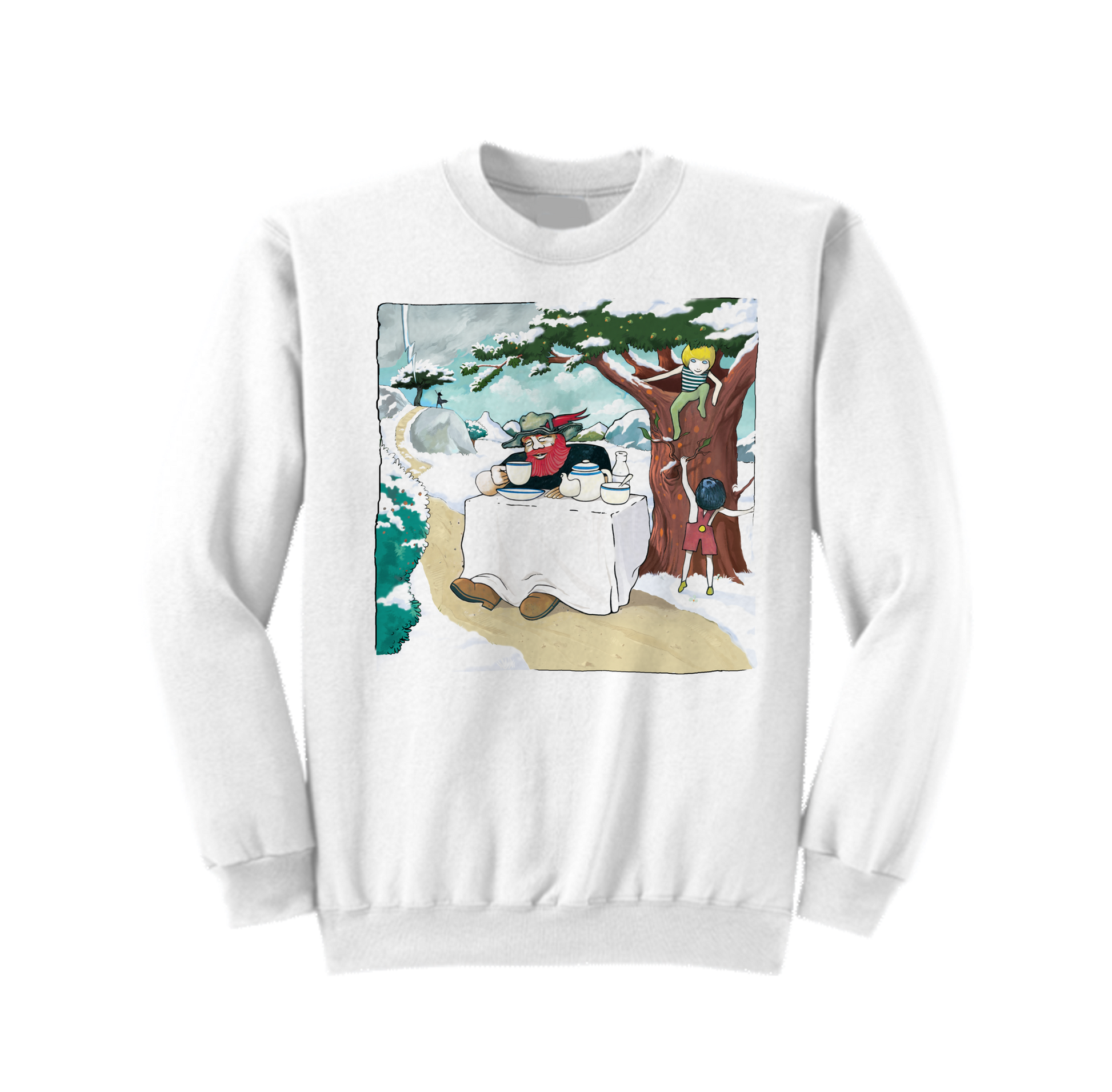 Join Tillerman for a hot cup of tea this cold season with this new 'Tillerman in Winter' Crewneck Sweatshirt take on the classic Yusuf / Cat Stevens character from the 'Tea For The Tillerman' album artwork.